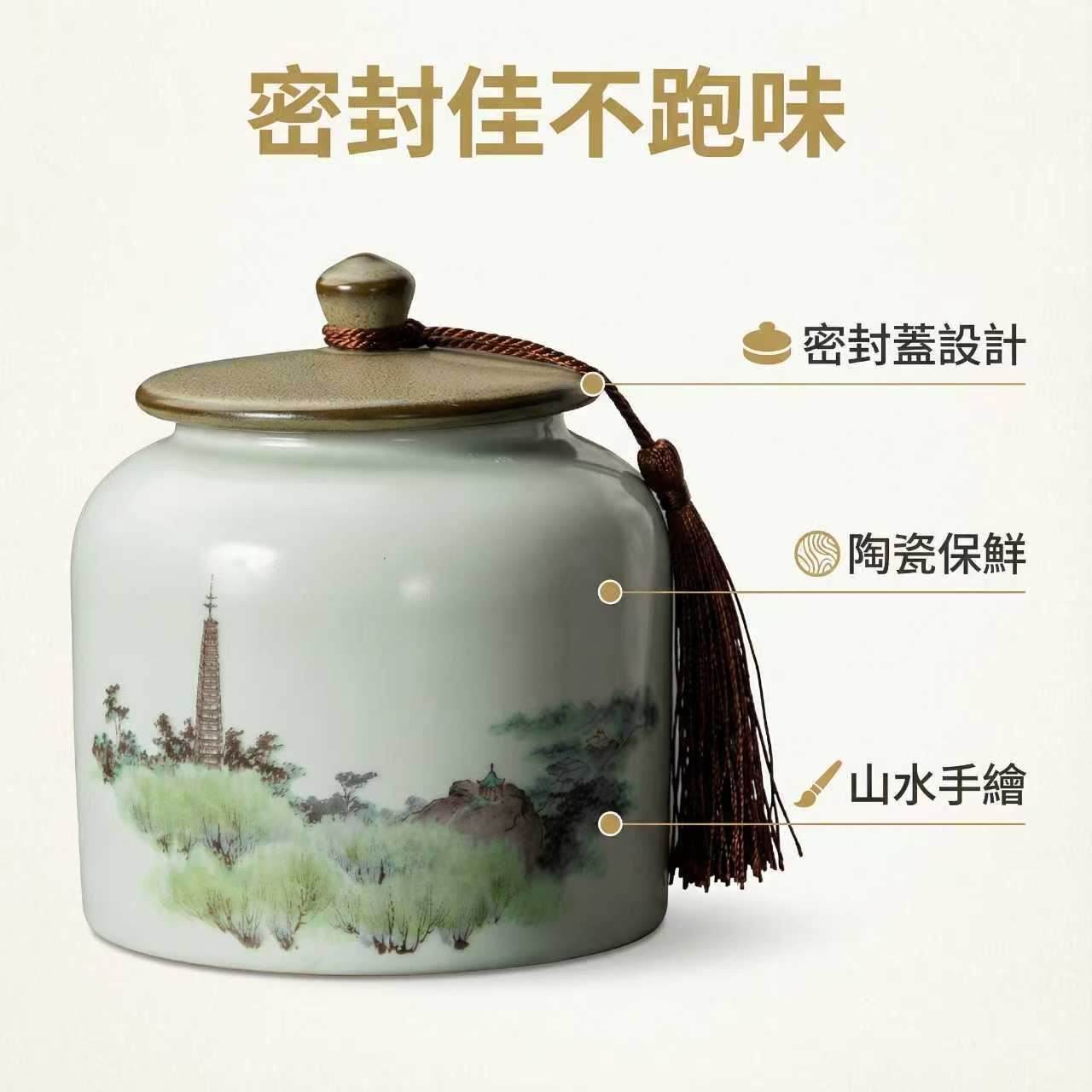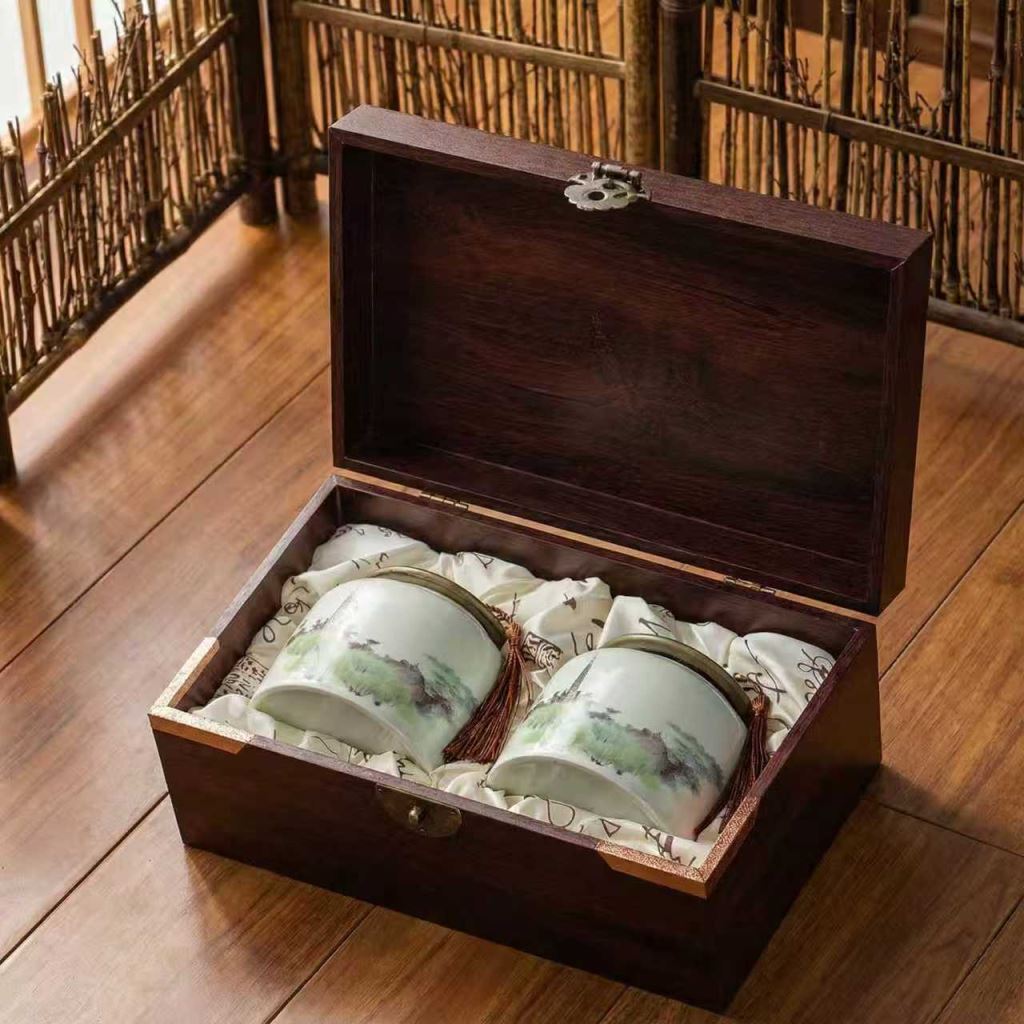 這款中式茶葉禮盒採用質感獨特的木盒包裝,內襯柔軟布料,以保持茶葉的香氣。盒內擺放著兩個飾有雅緻山水紋的瓷瓶。這款密封美觀的禮盒非常適合日常存放茶葉。其精緻的中式美學使其成為饋贈親友的理想之選,更添一份高雅格調。