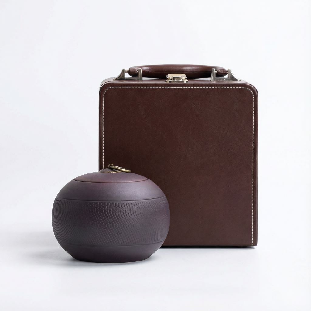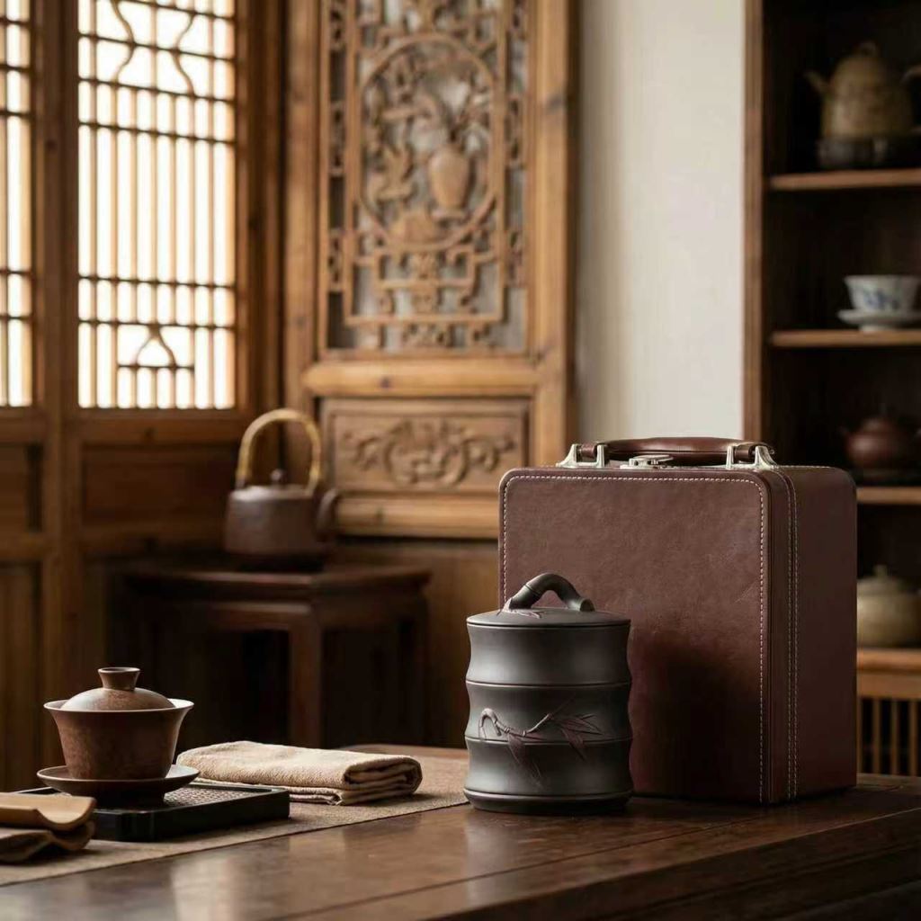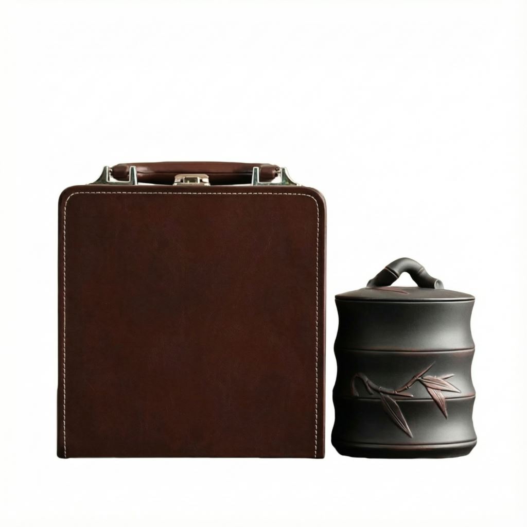 這款紫陶圓滿單罐手提禮盒,以棕調皮質禮盒為載體,精緻縫線搭配金屬扣手提設計,便攜又顯沉穩質感;搭配紋理細膩的紫陶罐(容量 1200ml),罐身古樸有質感且密封紋理適配收納茶葉、茶點等好物。不管是商務饋贈的高端禮贈,或是茶友間分享茶品的心意包裝,或是自用收納茶類乾貨,它都能憑質感與實用屬性,兼顧儀式感與日常需求。