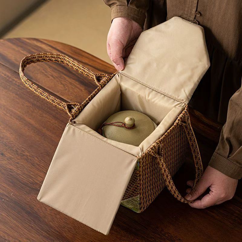 這款中式雅緻藤編手提禮盒,以自然質感的藤編為籃身基底,搭配花紋布藝飾片與流蘇掛飾,復古格調盡顯;配套繪有山水紋樣的瓷罐(蓋鈕扣綴流蘇),密封性能適配收納茶葉、茶點等好物,手提籃不管是中式伴手禮的心意饋贈、茶事場合的茶品包裝,還是居家收納茶類乾貨,它都能憑中式美學質感與實用屬性,兼顧儀式感與日常需求。