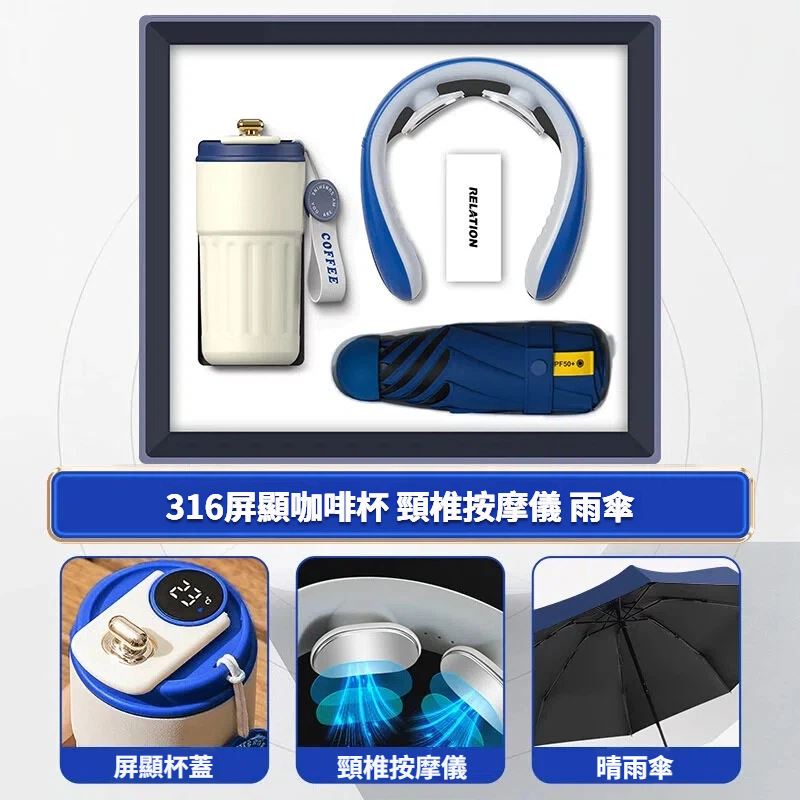 這款實用生活禮盒組包含一個帶有溫度顯示蓋的316不銹鋼水杯(方便查看飲品溫度)、一個頸部按摩器(舒緩頸部疲勞)和一個時尚雨傘。所有物品均裝在一個精美的禮盒中。它不僅滿足您日常通勤的飲水和遮陽需求,還能在辦公室休息時幫助您放鬆頸部。這款兼具便利性和舒適性的精美產品,也是饋贈親朋好友的貼心之選。