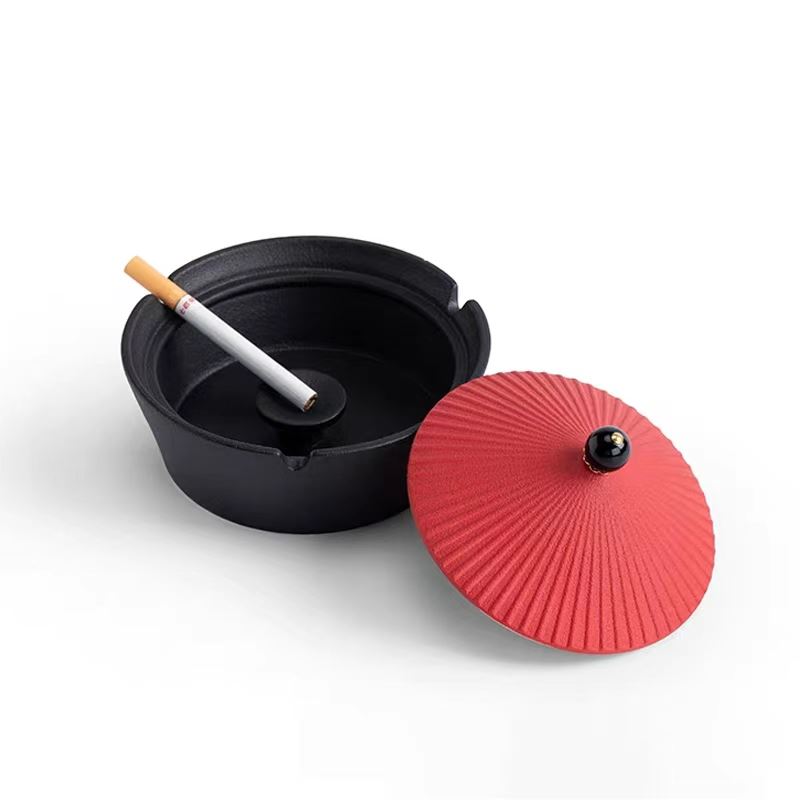 這款煙灰缸的設計靈感來自唐代官帽,呈現出復古的官帽造型。紋理豐富的紅色蓋子飾以黑色珠子,與黑色缸體相得益彰,展現出濃鬱的中國傳統美學。缸體內置煙嘴,合上蓋子後可整齊地收納煙灰。它不僅實用,方便存放日常煙灰,其獨特的中國風設計也使其成為茶几或其他桌面上的一道亮麗風景。這是一款兼具實用性與美觀的中國風生活用品。
