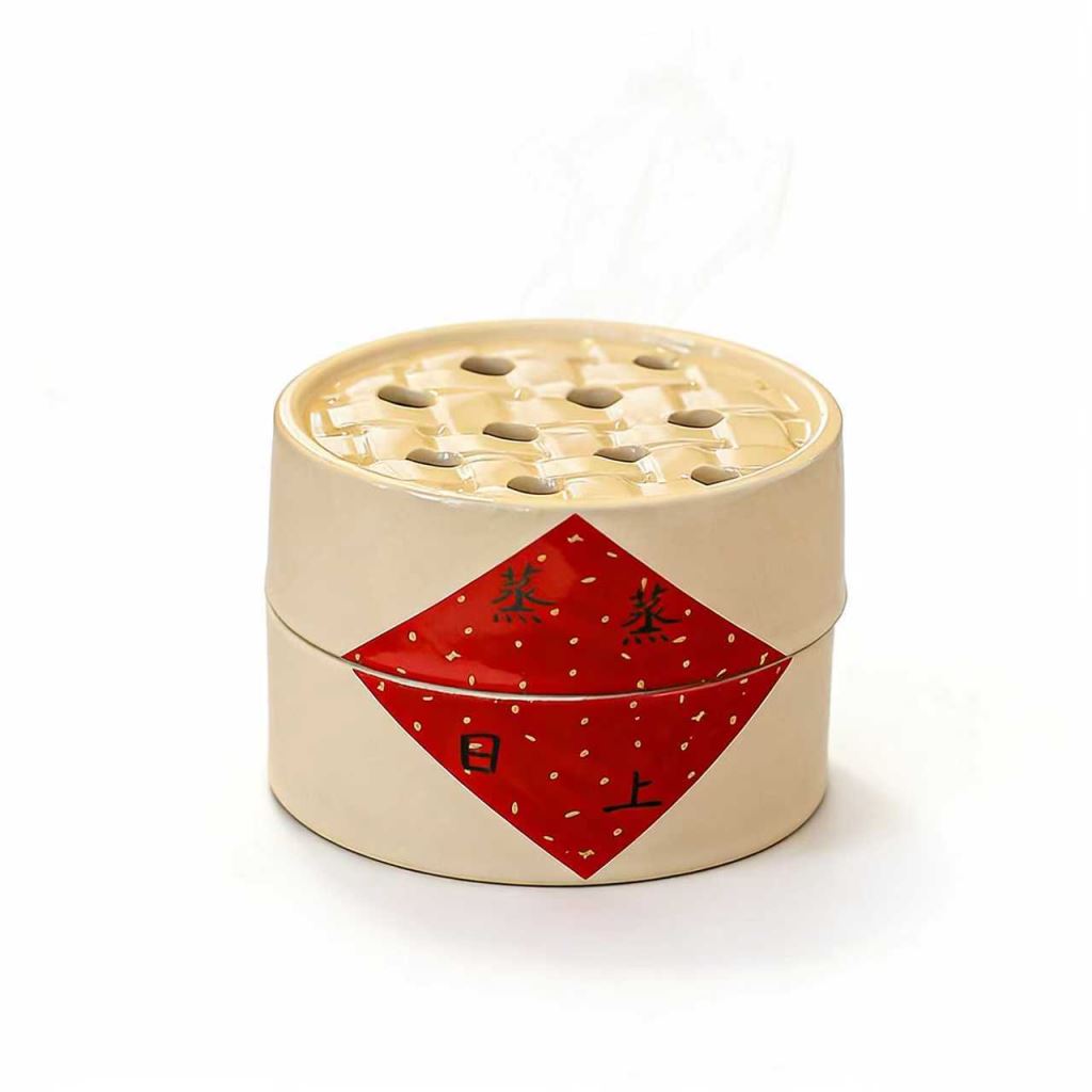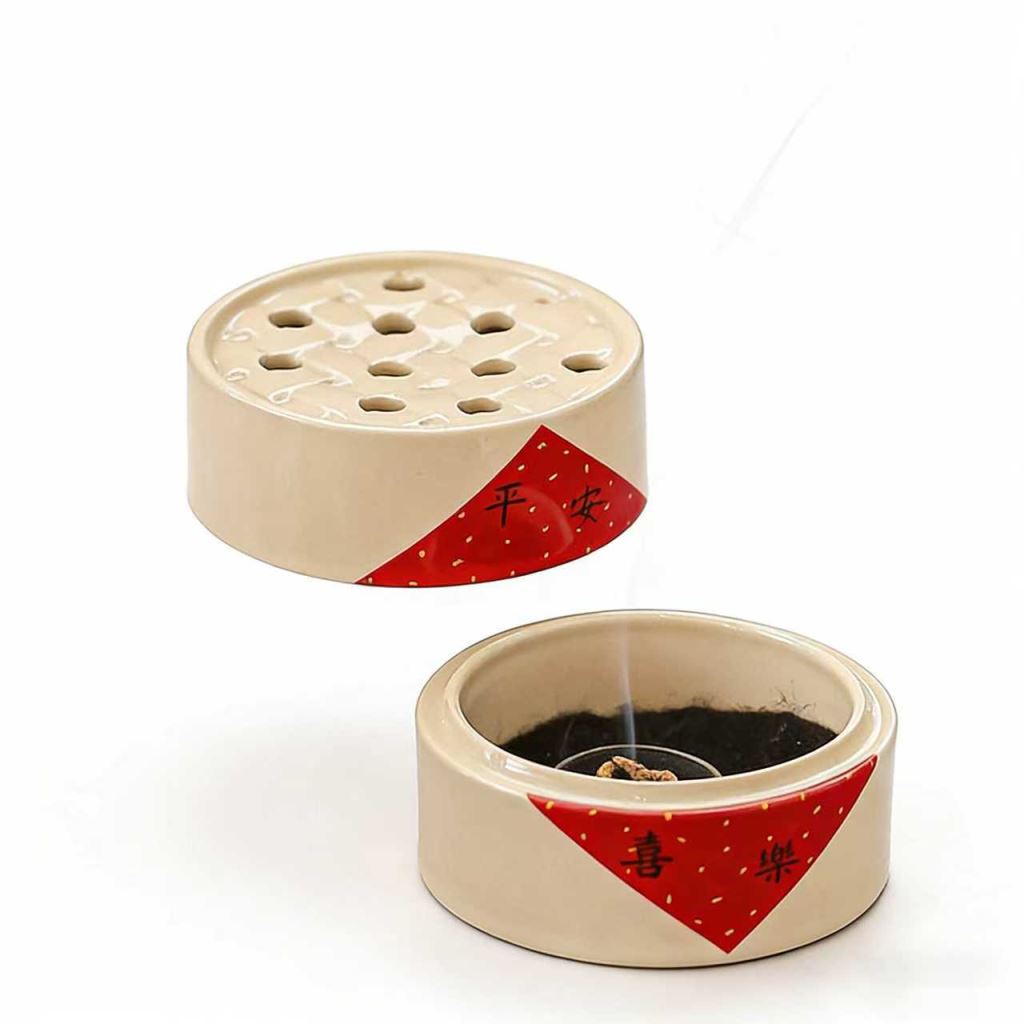這款溫暖的陶瓷香氛盒靈感源自中國傳統蒸籠。盒身飾以寓意吉祥的紅色「日進鬥金」字樣和金色圓點,營造出奢華舒適的氛圍。頂部的通風孔使香氣更容易散發。雙層壁設計方便存放香薰原料,讓您享受多種香氛,包括線香和粉紅香。它不僅具有舒緩身心的香薰功能,其趣味十足的設計和吉祥的圖案也為任何桌面增添了一抹優雅氣息。這款小巧實用的香氛盒將香薰療法與吉祥寓意完美結合,是居家或茶几使用的理想之選。