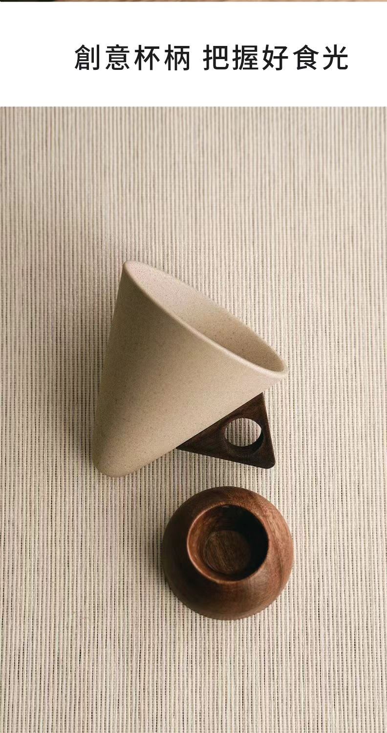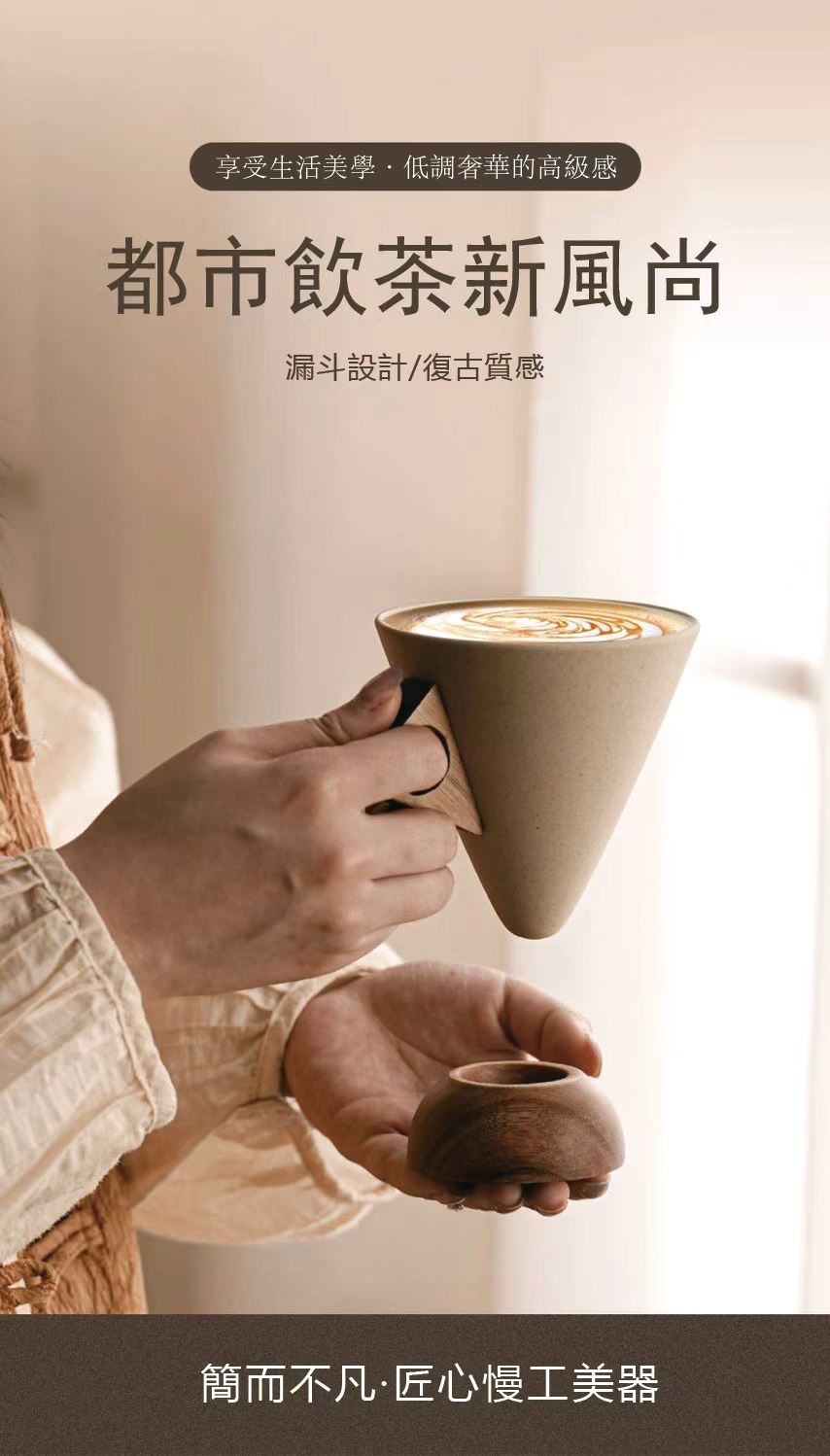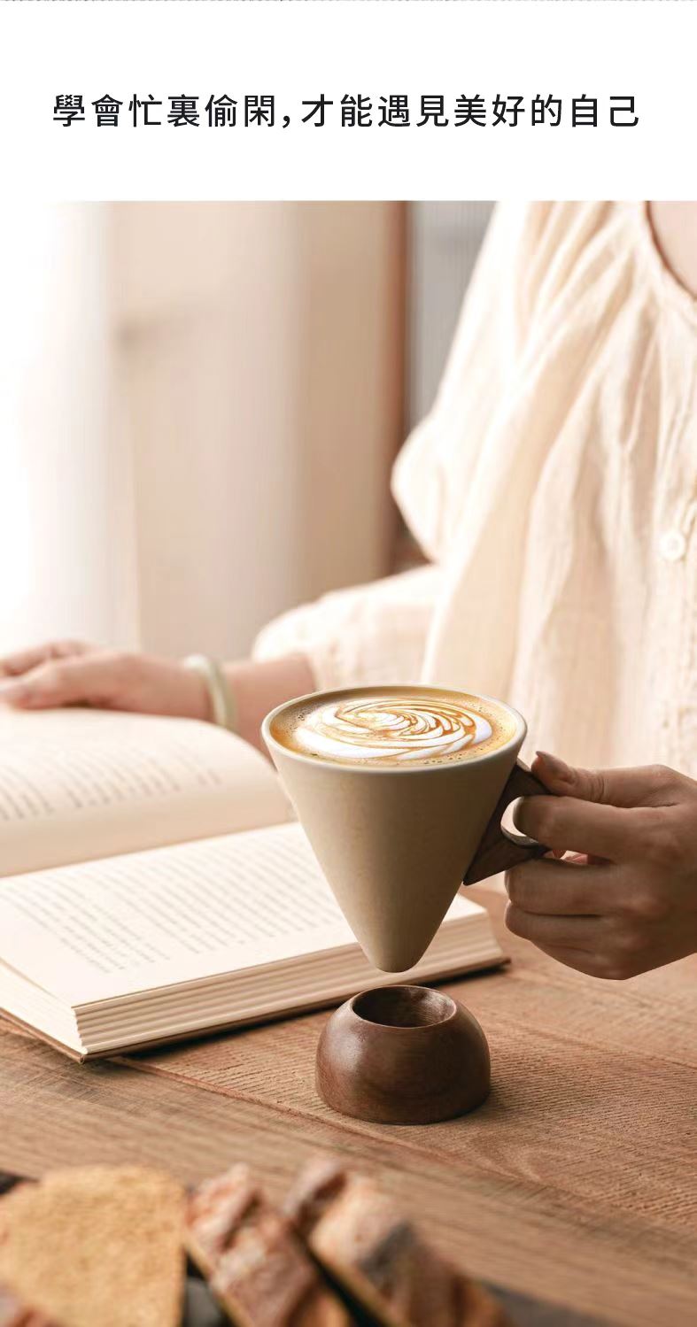這款極簡主義咖啡杯採用磨砂錐形杯身、鏤空木質手柄和配套實木杯墊,營造出溫暖而略帶復古的氛圍。其造型與拉花藝術相得益彰,舒適的握感和隔熱杯墊使其成為居家咖啡小憩或辦公室晨間咖啡的理想之選。它既是提升咖啡顏值的實用工具,也是時尚的桌上裝飾。對於咖啡愛好者來說,這是一款貼心的禮物,無論是自己享用還是與朋友分享,都是絕佳之選。