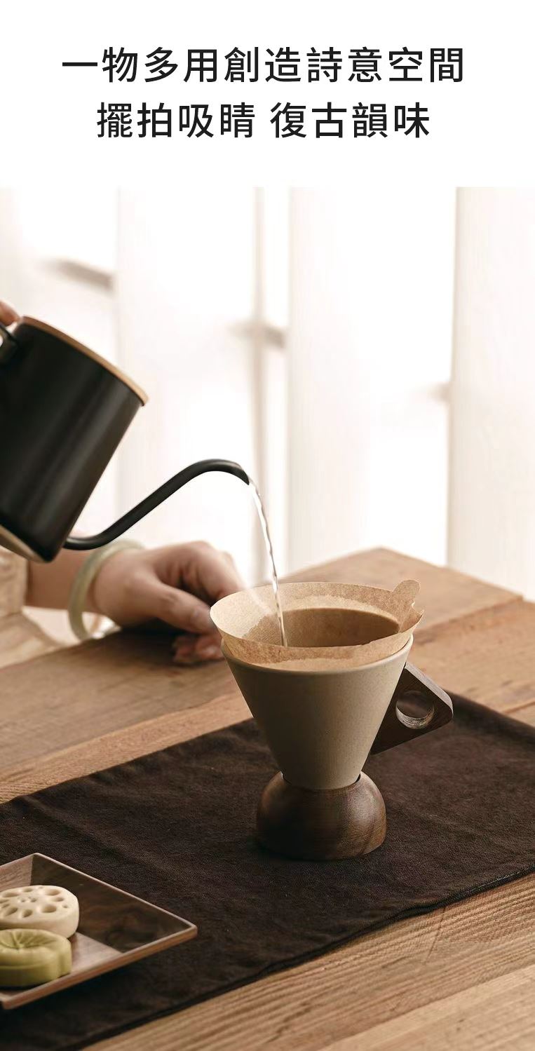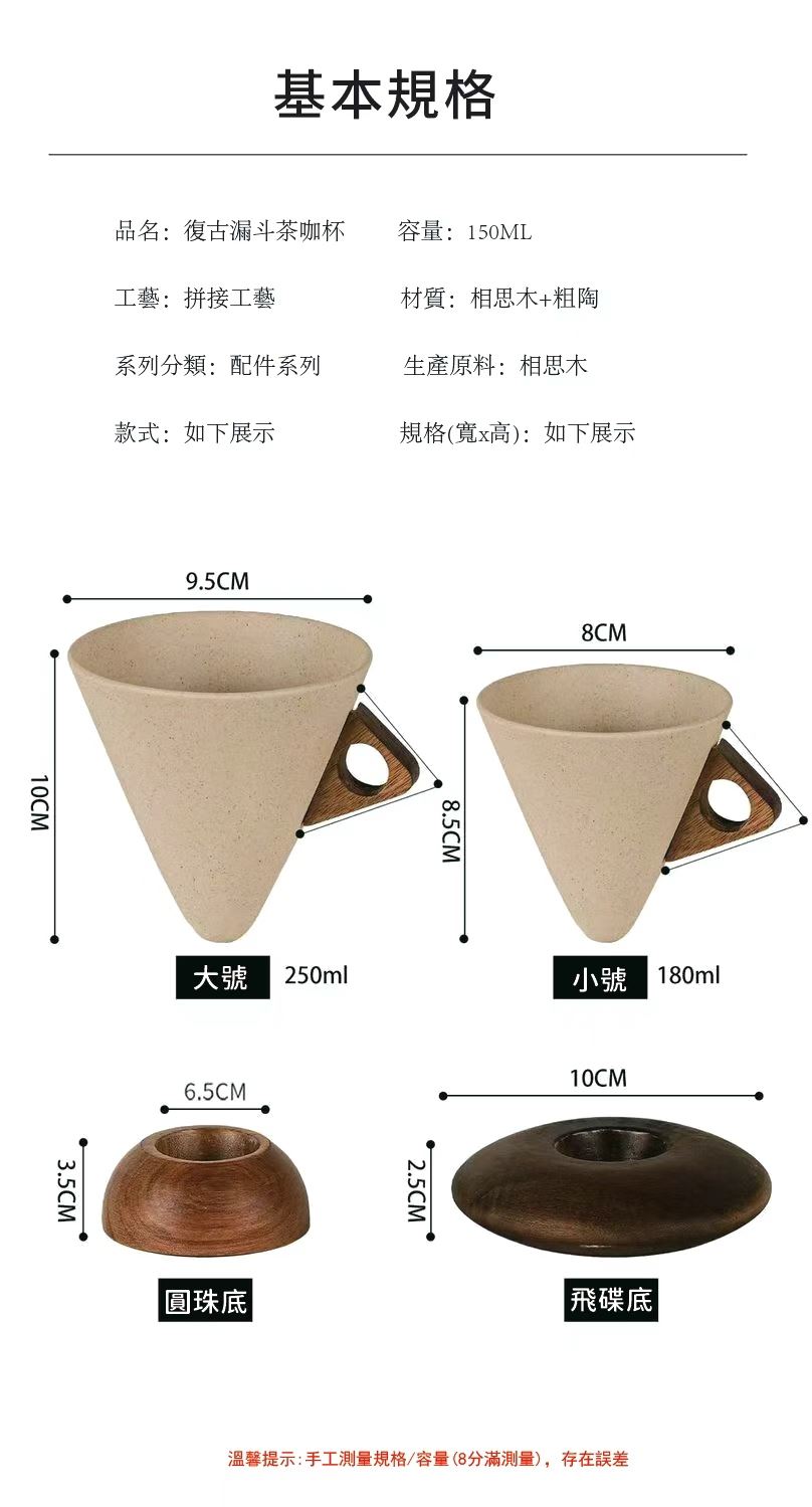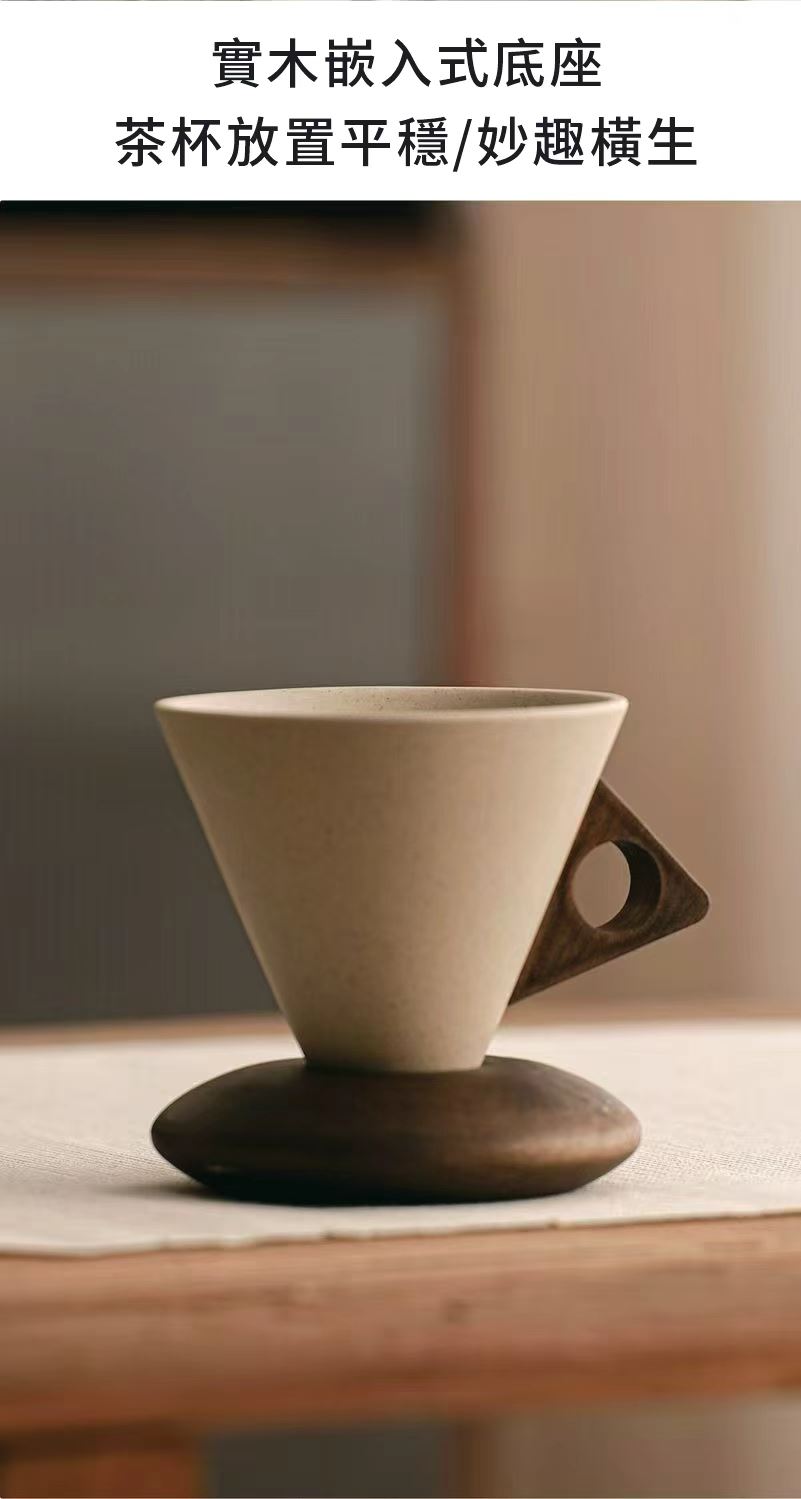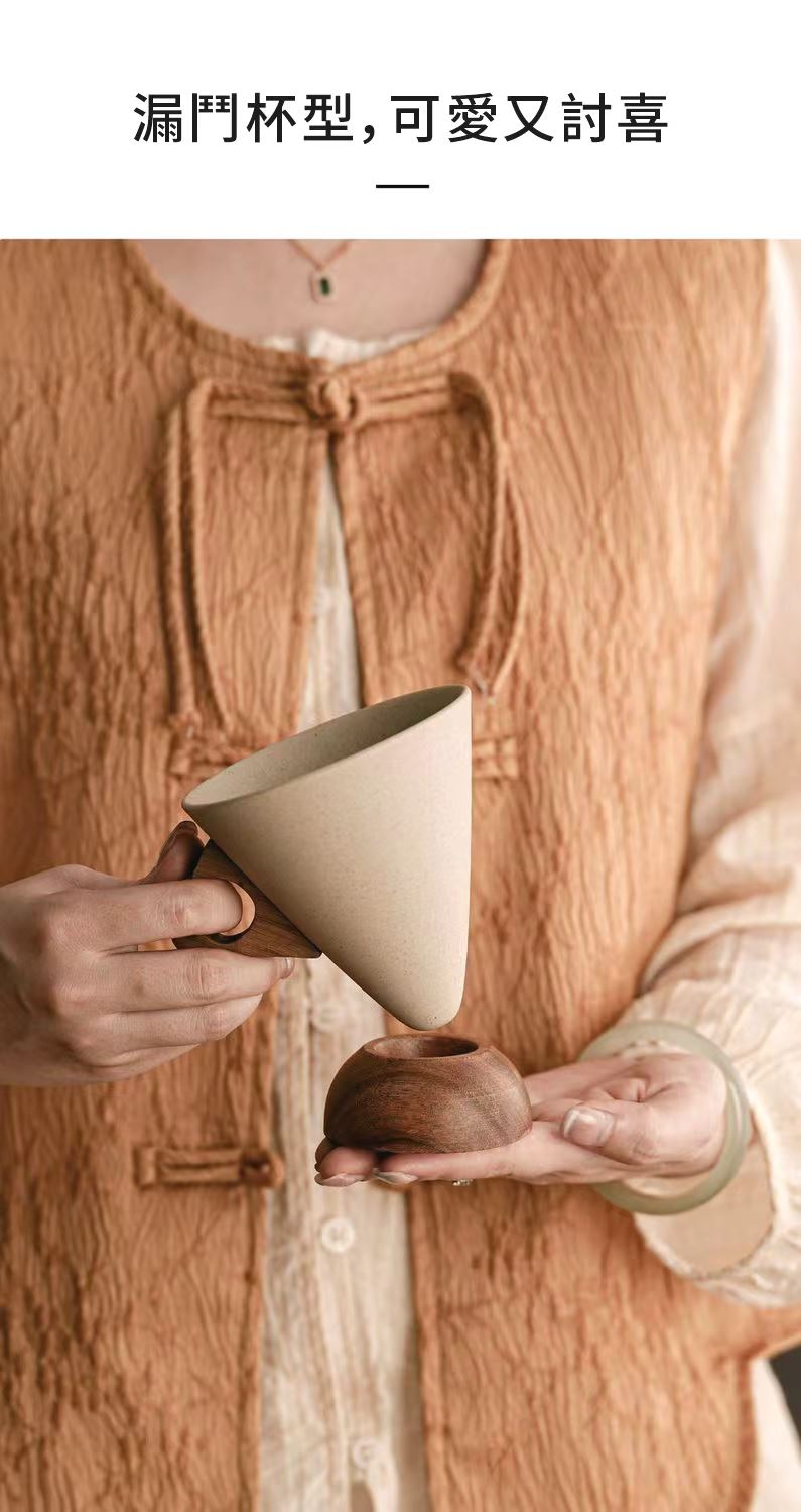 這款極簡主義咖啡杯採用磨砂錐形杯身、鏤空木質手柄和配套實木杯墊,營造出溫暖而略帶復古的氛圍。其造型與拉花藝術相得益彰,舒適的握感和隔熱杯墊使其成為居家咖啡小憩或辦公室晨間咖啡的理想之選。它既是提升咖啡顏值的實用工具,也是時尚的桌上裝飾。對於咖啡愛好者來說,這是一款貼心的禮物,無論是自己享用還是與朋友分享,都是絕佳之選。