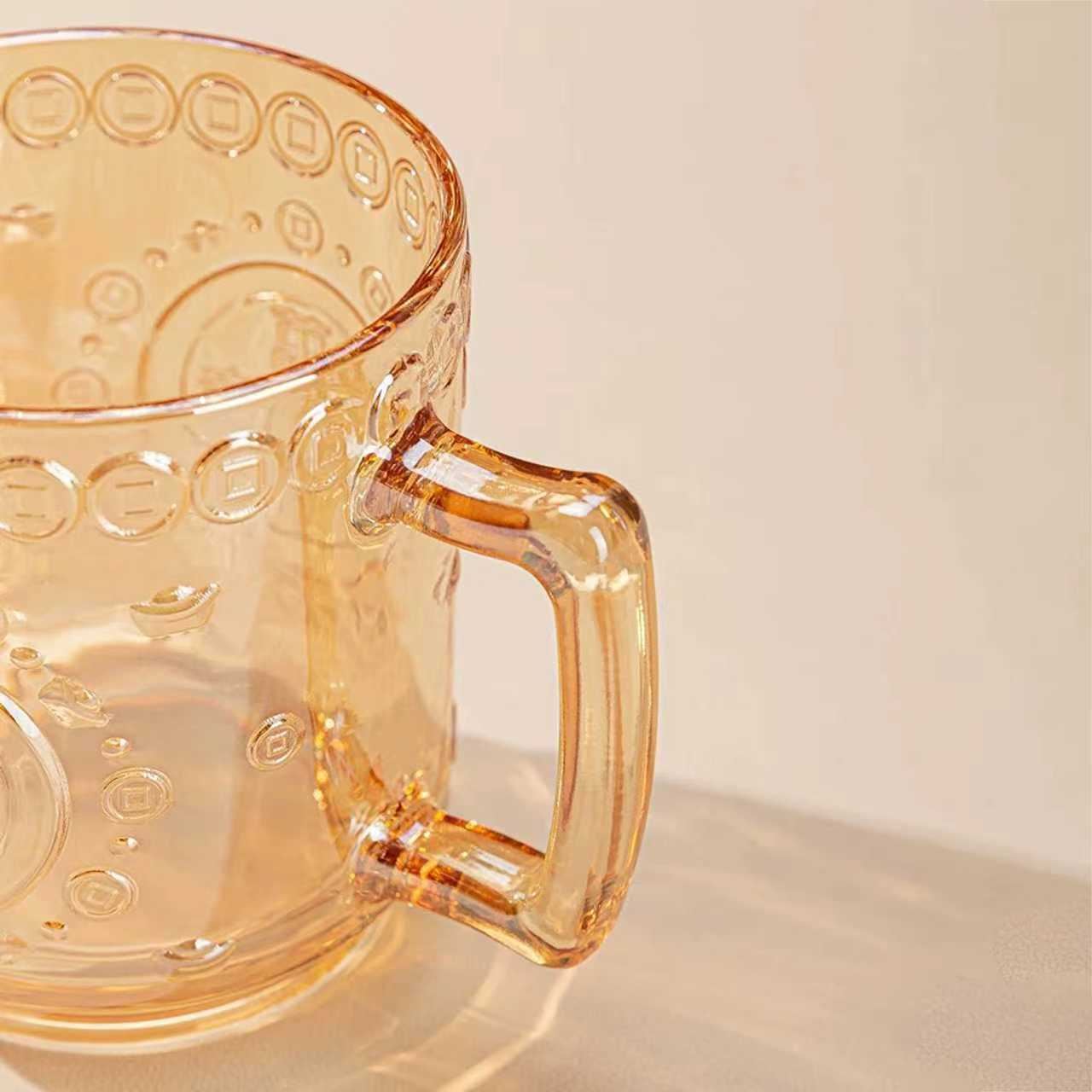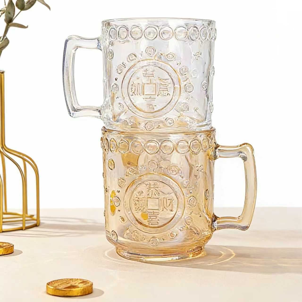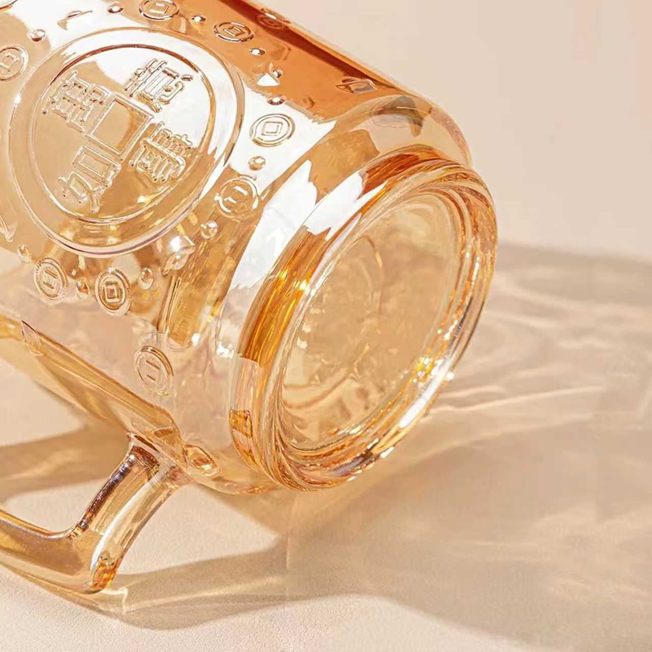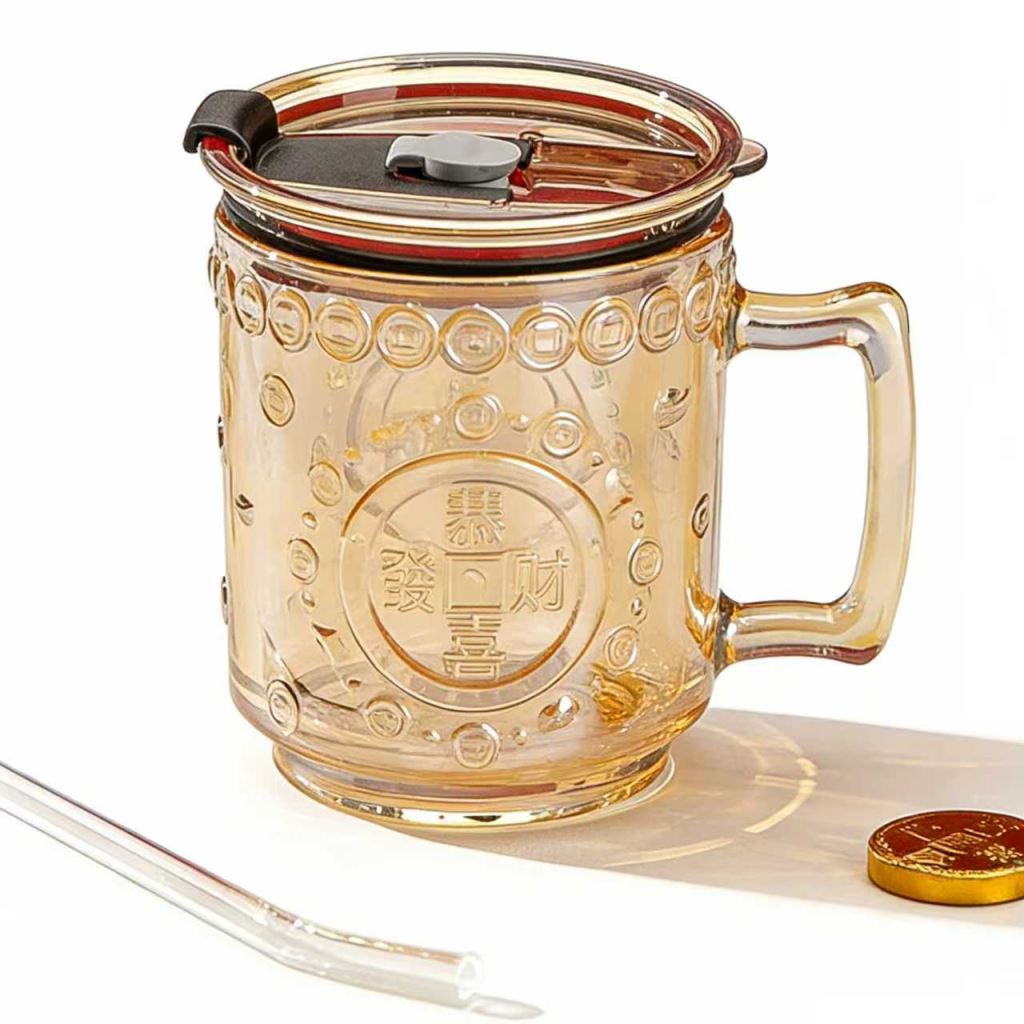 這款中式招財主題玻璃杯,是自帶好彩頭的居家飲水好物 —— 杯身印滿銅錢紋理與 “招財” 字樣,透明、琥珀色兩款通透質感襯出中式趣味,搭配把手設計防燙又好握持;不管是日常泡花茶、喝溫水,還是作為桌面的討喜,搭配手法,既容易當真。