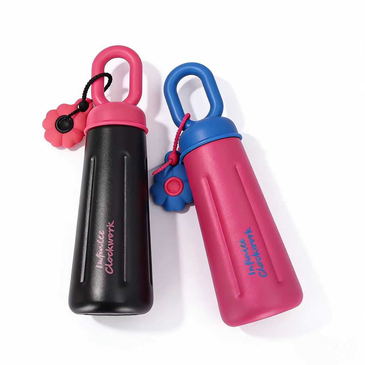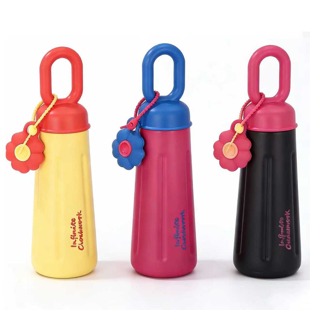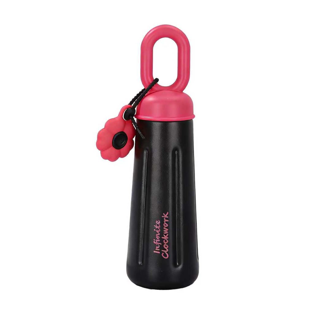 這款撞色萌趣便攜水壺,是外出帶飲的吸睛小搭檔 —— 黑紅、粉藍的撞色搭配自帶潮流感,環形提手既方便直接拎握,也能掛在包側解放雙手,花朵掛飾更添俏皮細節,瓶身的文字裝飾讓顏灑熱設計;不管是通勤裝溫水、逛街帶冰飲,還是出遊隨身裝果茶,它都能憑撞色顏值與貼心設計,讓帶飲既好看又省心。