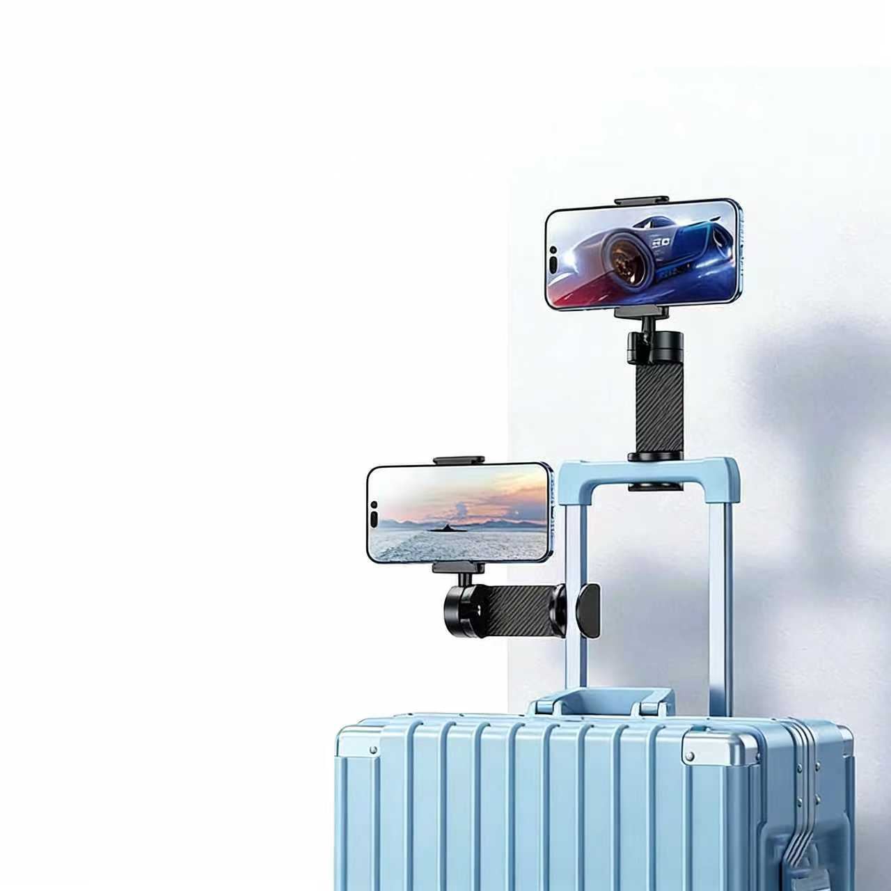 這款行李箱拉桿手機支架是出行拍攝的實用輔助裝備 —— 可直接固定在行李箱拉桿上,無需額外攜帶三腳架,便攜不佔出行裝備空間;雙機位設計可同時支撐兩部手機,適配旅行 vlog 拍攝、戶外直播等場景,支架角度可靈活調節,能滿足不同拍攝需求;不管是機場途中手法