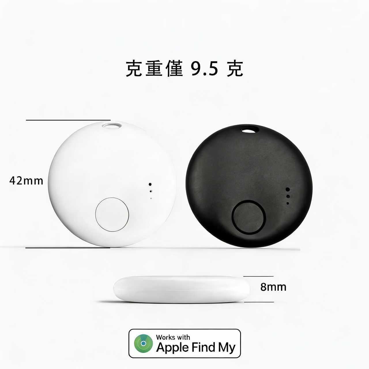 這款黑白雙色的迷你防丟追蹤器,是蘋果生態用戶的實用隨身配件 —— 僅 9.5 克的超輕重量搭配 42mm 直徑、8mm 厚度的輕薄身形,可輕鬆掛在鑰匙、背包、行李箱等物品上,便攜無負擔;支持 Apple Find My功能,能透過蘋果設備精準定位物品位置,適配日常防丟、出行追蹤行李等場景,簡約圓潤的外觀設計兼具質感與實用性,不管是防止鑰匙遺失,還是追蹤出行行李,都能以穩定的定位性能成為省心的隨身輔助工具。
