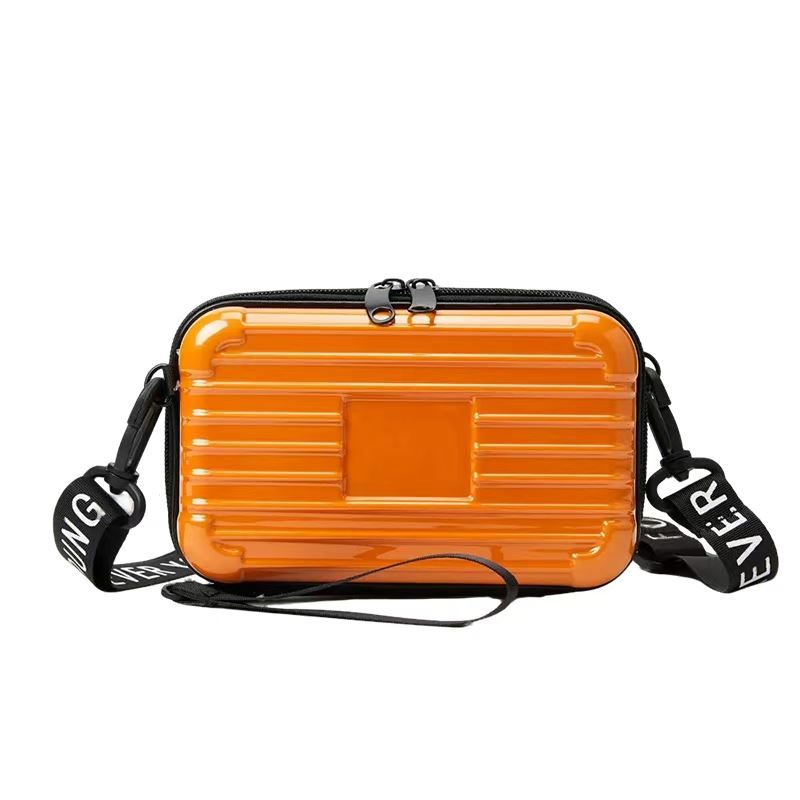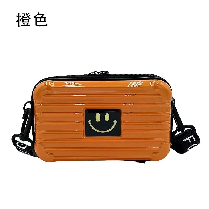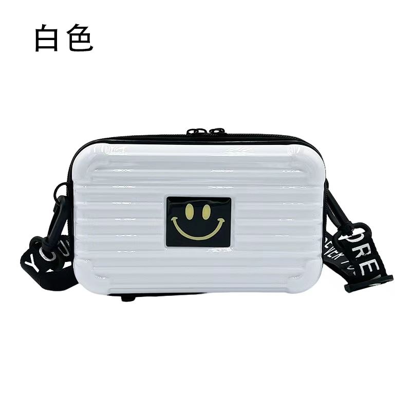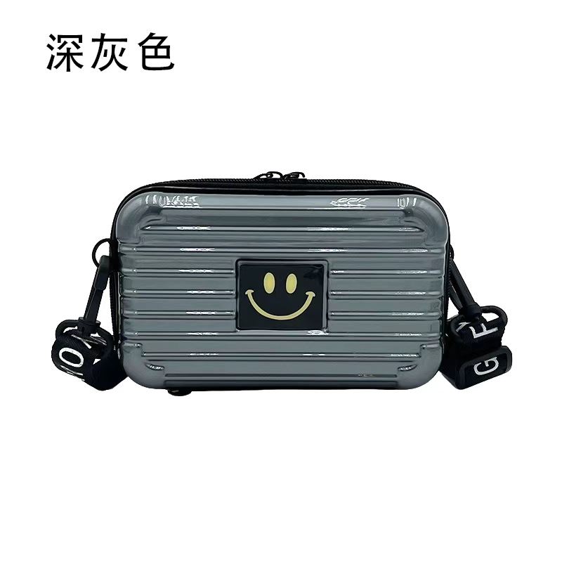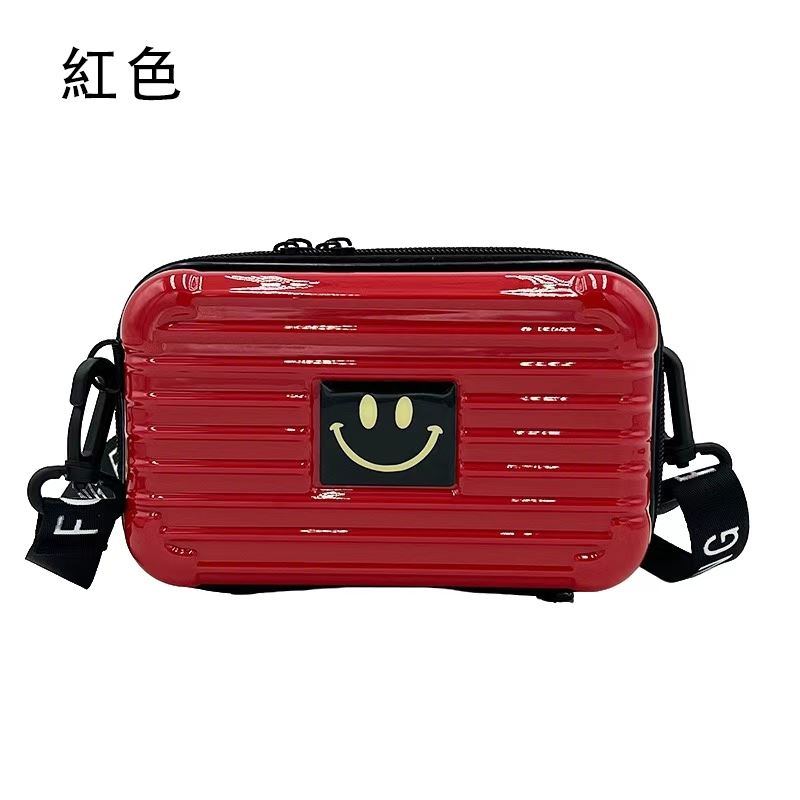 這款硬殼斜背包是日常穿搭的甜酷風單品 ——採用亮面耐磨的硬殼材質製作,耐刮防壓且質感十足,迷你行李箱般的造型自帶復古時尚感,正面點綴的黃色笑臉元素則為硬朗的殼身增添了俏皮活力;配套的可調節字母肩帶適配不同身高,背負舒適不勒肩,包身容量適中,可輕鬆收納手機、口紅、紙巾等隨身小物;不管是日常通勤、逛街約會還是短途出行,它既能憑藉甜酷兼具的造型成為穿搭亮點,又能以耐用防壓的屬性滿足實用收納需求,是個性女孩的出街好幫手。