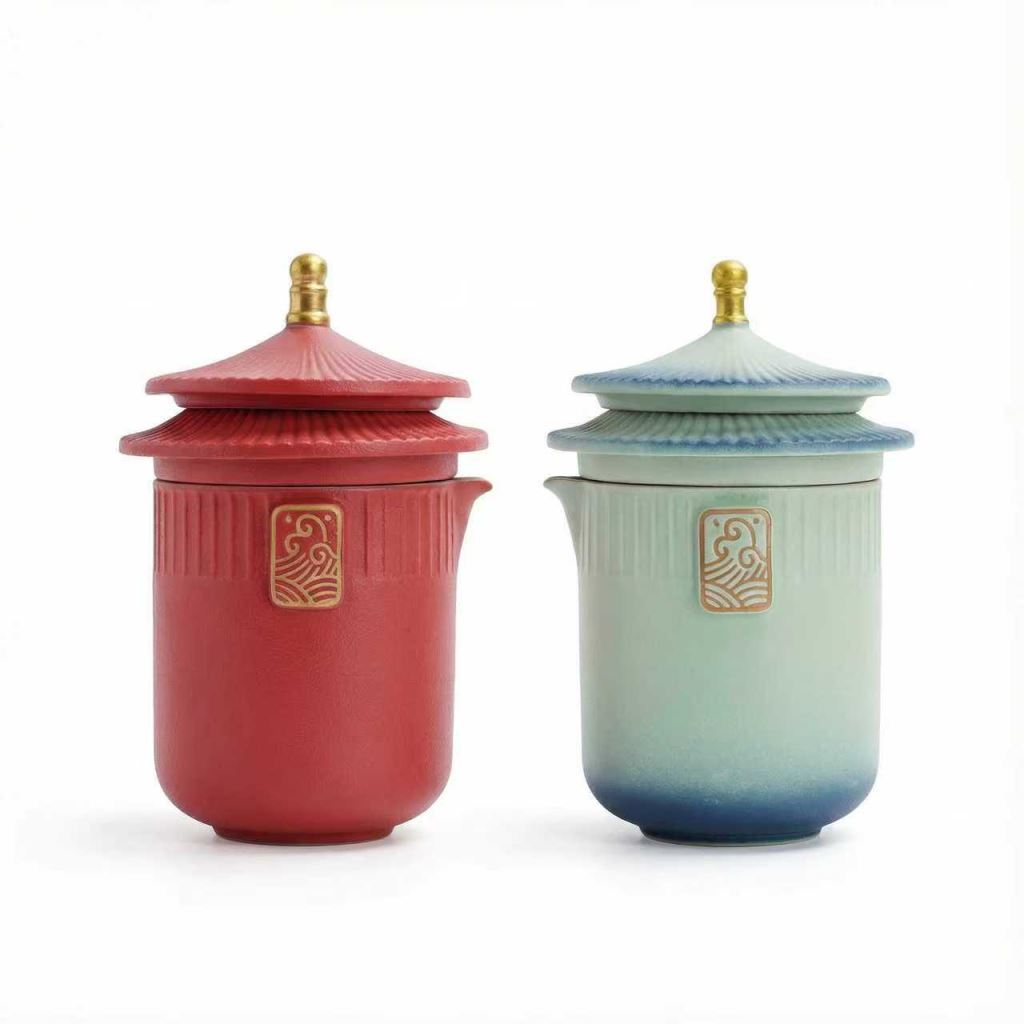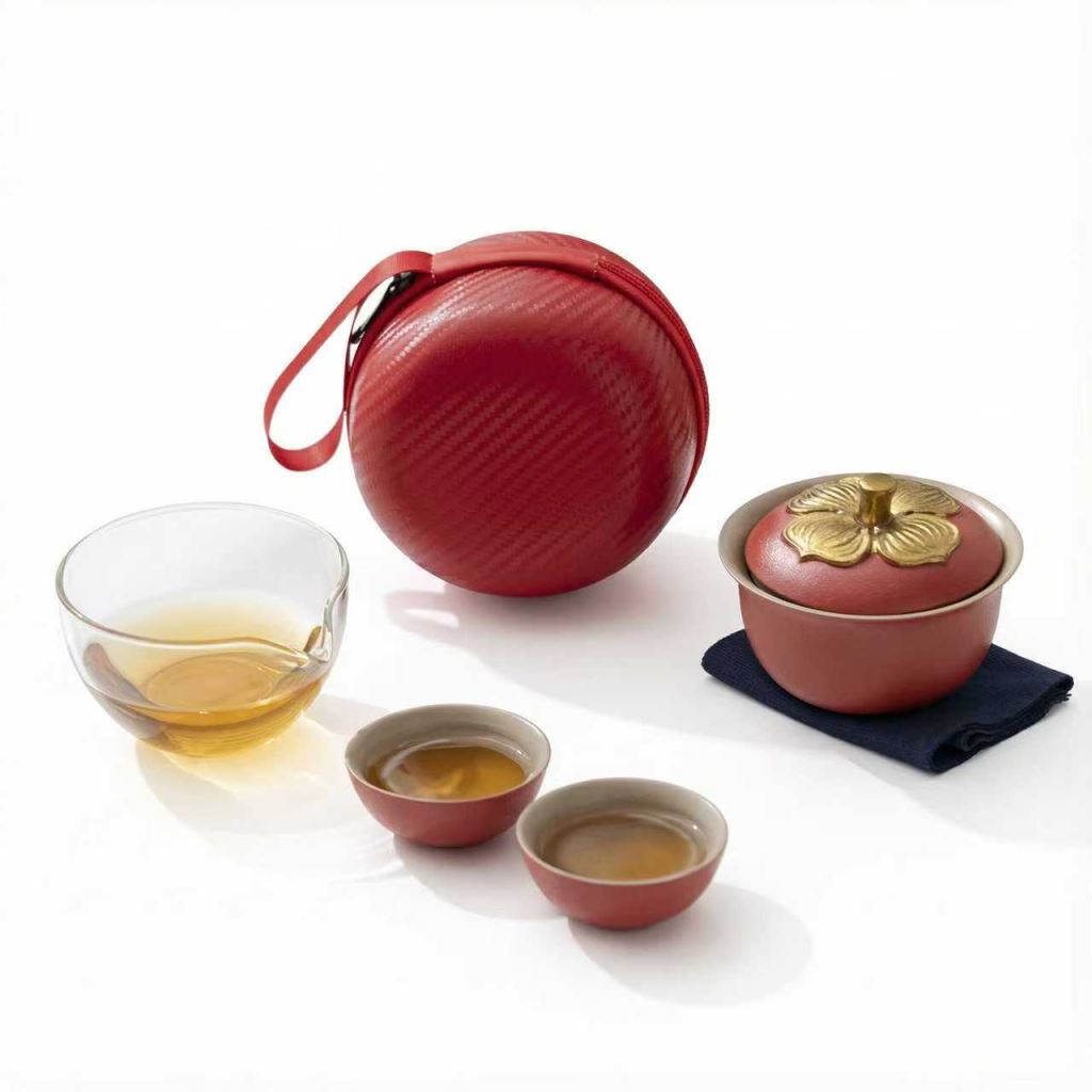 這款精美的紅色便攜式茶具套裝包含一個茶壺和茶杯,均採用質感豐富的紅色釉面。茶壺蓋飾以精緻的金色花瓣圖案,套裝還包含透明茶杯。它既美觀又實用。隨附的球形收納袋附有提手,方便攜帶。這款茶具色彩鮮豔,設計優雅,非常適合日常居家使用,也是節慶禮物的理想選擇。它將便攜性與茶道的儀式感完美融合,兼具美觀、實用和時尚。