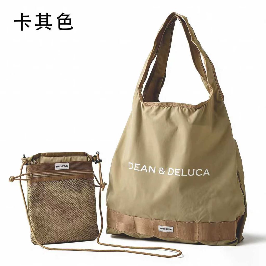 这款卡其色联名子母包套装是日常通勤与轻出行的实用搭配单品 —— 大包采用轻便耐磨的防水尼龙面料,卡其色调简约百搭,印有 “DEAN & DELUCA” 标识,大容量包身可轻松收纳通勤物品、采购物资等,宽肩带设计背负舒适不勒肩;配套的网面斜挎包则以透气网布 + 耐磨布面拼接,适合放置手机、钥匙等随身小物,也可装盛水杯、水果等需通风的物品,抽绳收口设计兼具安全性与便捷性;套装可搭配使用也可单独携带,不管是日常通勤装物、周末采购,还是短途出行收纳随身物品,都能以简约质感与实用功能,成为省心的出行好帮手。